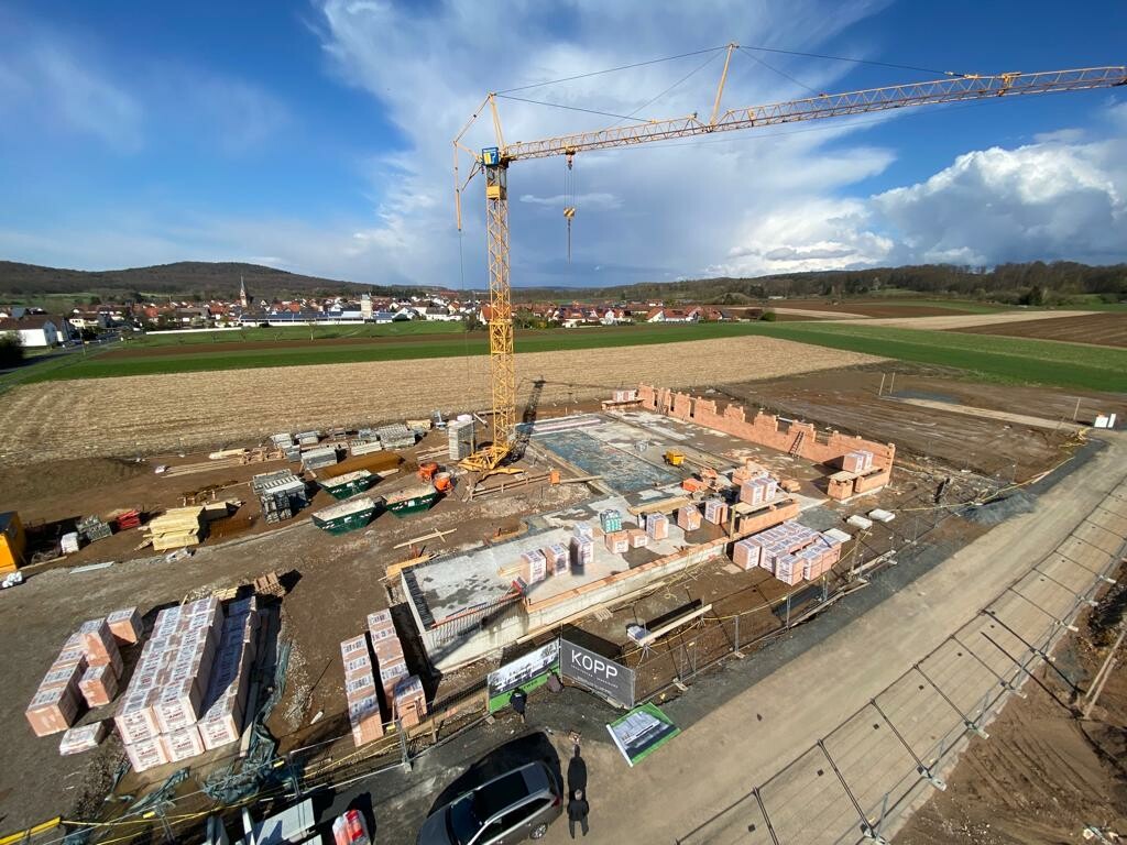 Es vergingen weitere fünf Monate bis endlich im Februar 2022 der Baukran gestellt wurde und mit den Arbeiten an der Bodenplatte begonnen werden konnte. wurde dann der Baukran gestellt, so dass mit den Arbeiten an der Bodenblatte begonnen werden konnte. Im Anschluss daran folgten Anfang April schon die Maurerarbeiten.